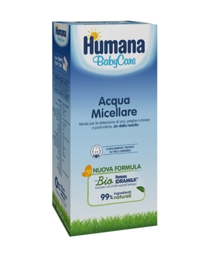 Acqua micellare ideale per la detersione di viso, pieghe cutanee e parti intime, sin dalla nascita. Questo prodotto è realizzato con il 99% di ingredienti di origine naturale. L’elevata naturalità della formula può comportare variazioni di colore, che non alterano la qualità del prodotto. Il restante 1% è composto da ingredienti che aiutano a conservare il prodotto e a migliorarne l’esperienza di utilizzo. Clinicamente testato su pelli sensibili. Con Bio Humana Idramilk, esclusivo mix di latti vegetali biologici. Ideale sin dalla nascita. Adatto per la detersione di piccole aree come viso e pieghe cutanee. Ideale per la detersione delle parti intime. Deterge delicatamente la cute lasciandola morbida e idratata.
