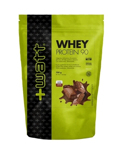 Whey Protein 90 Cacao 750 G Doypack. Prodotto da + WATT SRL. Minsan 980137020.